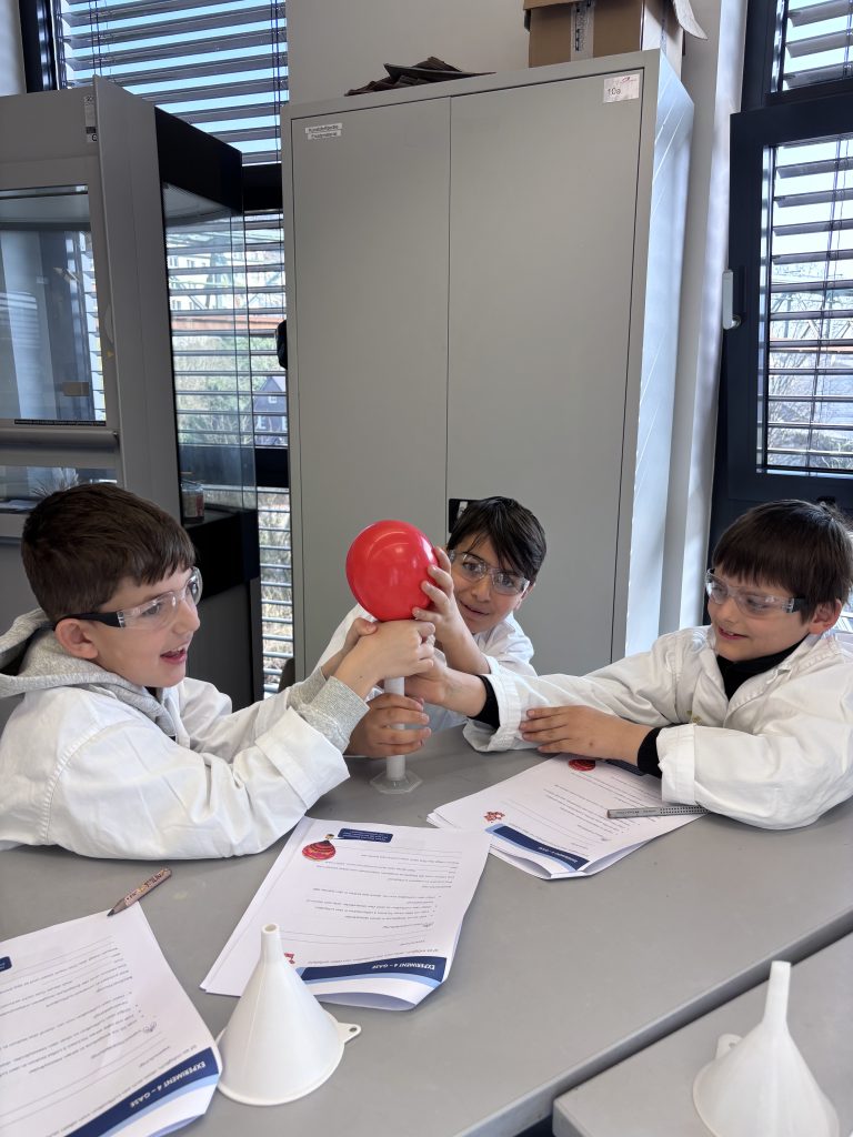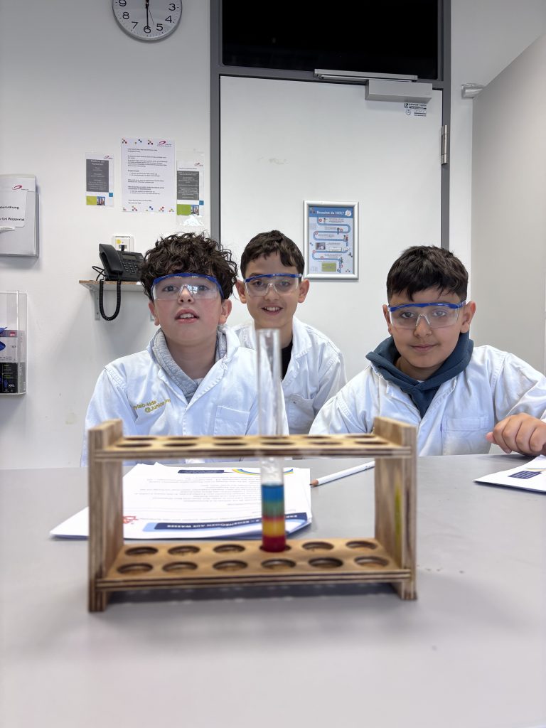 Mit viel Neugier und Begeisterung führten die Kinder verschiedene spannende Experimente durch. Besonders beeindruckend war ein Versuch, bei dem sich ein Luftballon ganz ohne Hineinpusten aufblähte. Außerdem gelang es den jungen Forscherinnen und Forschern, buntes Wasser vorsichtig zu schichten, sodass ein farbenfroher Regenbogen im Glas entstand.